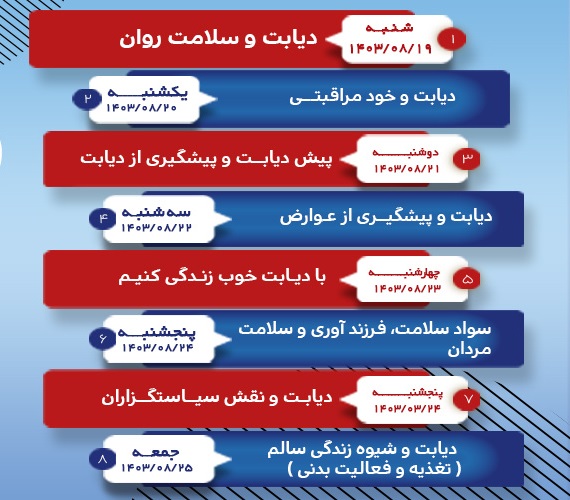 دفتر مدیریت بیماری های غیرواگیر معاونت بهداشت وزارت بهداشت، درمان و آموزش پزشکی روزشمار هفته ملی دیابت در سال 1403 را بشرح ذیل اعلام نموده است.
