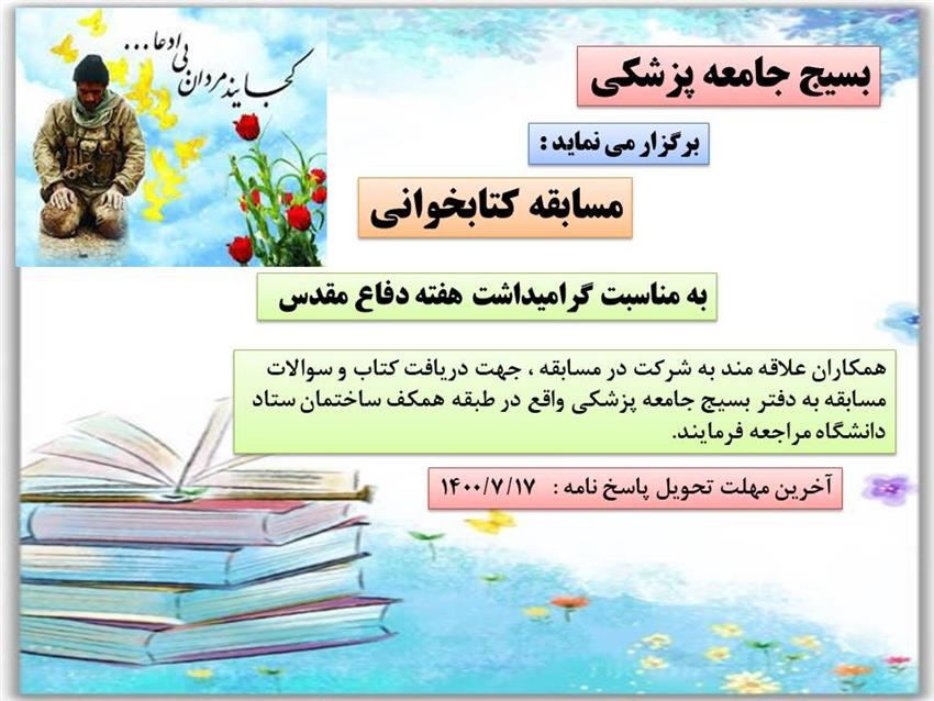 اطلاعیه برگزاری مسابقه کتابخوانی به مناسبت گرامیداشت هفته دفاع مقدس ۲۹ شهریور ۱۴۰۰ | ۱۱:۲۴ کد : ۲۰۲۹۴ اطلاعیه ارسال به دیگران نام شما ایمیل شما ایمیل دریافتکننده ارسال انصراف تعداد بازدید:۲۷۰۴۰
