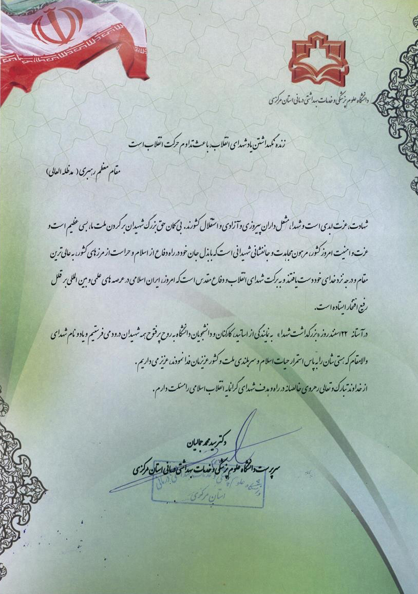 متن تقدیرنامه سرپرست دانشگاه برای بزرگداشت شهدا ۰۷ اسفند ۱۳۹۷ | ۱۳:۰۰ کد : ۳۰۱۸ اصلی ارسال به دیگران نام شما ایمیل شما ایمیل دریافتکننده ارسال انصراف تعداد بازدید:۴۶۸۶۲