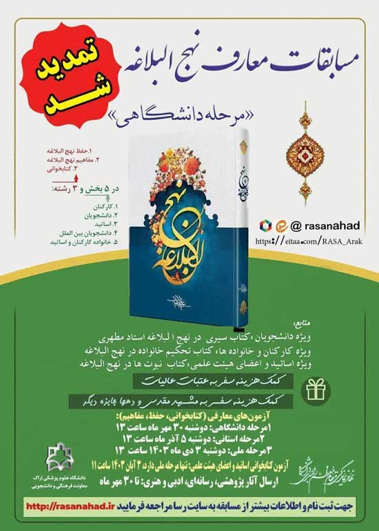 ضمن گرامیداشت هفته دفاع مقدس و آرزوی پیروزی جبهه مقاومت ، به اطلاع می رساند ثبت نام و برگزاری مسابقات جشنواره ملی نهج البلاغه دانشگاهیان کشور تمدید گردیده است.