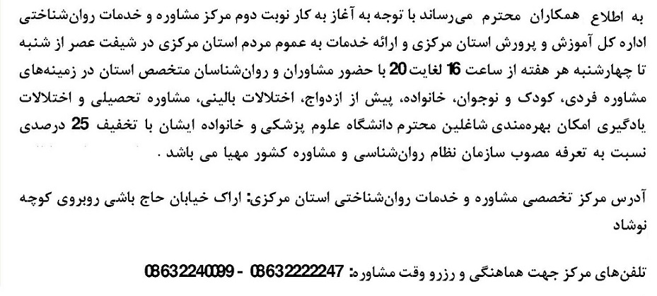 مرکز تخصصی مشاوره وخدمات روانشناختی ۱۲ آبان ۱۴۰۳ | ۱۳:۰۴ کد : ۴۷۳۷۱ اطلاعیه ارسال به دیگران نام شما ایمیل شما ایمیل دریافتکننده ارسال انصراف تعداد بازدید:۱۰۰۹۷ آغاز به کار نوبت دوم (شیفت عصر) مرکز تخصصی مشاوره و خدمات روانشناختی اداره کل آموزش و پرورش استان مرکزی و ارائه خدماات با تخفیف ۲۵ درصدی به شاغلین دانشگاه علوم پزشکی