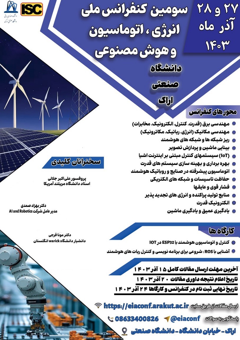 به اطلاع می رساند، دانشگاه صنعتی اراک در نظر دارد همایش ملی انرژی اتوماسیون صنعتی و هوش مصنوعی را در تاریخ ۲۷ و ۲۸ آذر ماه ۱۴۰۳ در محل این دانشگاه برگزار نماید. این رویداد فرصتی مناسب برای تبادل دانش و تجربیات تخصصی در حوزه های مختلف صنعت و فناوری های نوین مرتبط با انرژی و هوش مصنوعی خواهد آورد. محورهای اصلی این همایش به شرح ذیل زیر است.