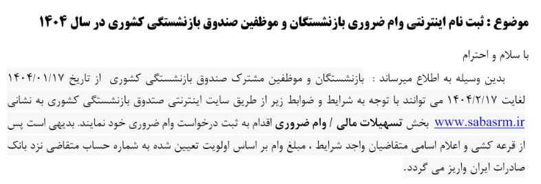 ثبت نام اینترنتی وام ضروری بازنشستگان و موظفین صندوق بازنشستگی کشوری ۲۰ فروردین ۱۴۰۴ | ۱۱:۵۹ کد : ۵۰۶۴۱ اطلاعیه ارسال به دیگران نام شما ایمیل شما ایمیل دریافتکننده ارسال انصراف تعداد بازدید:۴۴۸۷ ثبت نام اینترنتی وام ضروری بازنشستگان و موظفین صندوق بازنشستگی کشوری