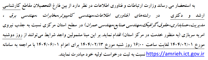 چهارمین مرحله جذب نیروی امریه سربازی در وزارت ارتباطات و فناوری اطلاعات ۲۷ فروردین ۱۴۰۴ | ۱۵:۱۱ کد : ۵۰۸۰۸ اطلاعیه ارسال به دیگران نام شما ایمیل شما ایمیل دریافتکننده ارسال انصراف تعداد بازدید:۴۳۳۷ فراخوان چهارمین مرحله جذب نیروی امریه سربازی در وزارت ارتباطات و فناوری اطلاعات