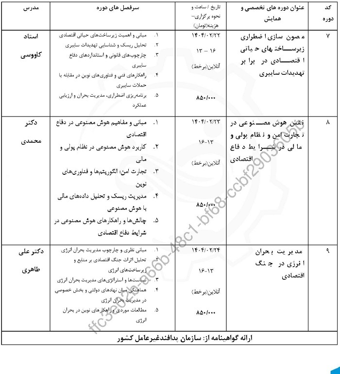 سازمان پدافند غیرعامل کشور دوره آموزشی «دفاع اقتصادی و نقش نظام حکمرانی در اقتصاد مقاومتی» را در تاریخ 1404/2/16 به صورت آنلاین (برخط)، با هماهنگی شرکت ایده بنیان رایان برگزار می نماید.