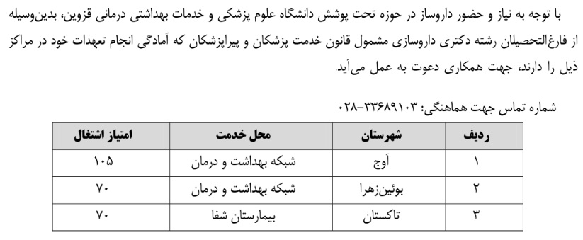 جذب نیروی داروساز مشمول قانون خدمت ۲۵ آذر ۱۴۰۴ | ۰۹:۰۰ کد : ۵۷۰۵۷ اطلاعیه ارسال به دیگران نام شما ایمیل شما ایمیل دریافتکننده ارسال انصراف تعداد بازدید:۷۴۱ جذب نیروی داروساز مشمول قانون خدمت در دانشگاه علوم پزشکی قزوین