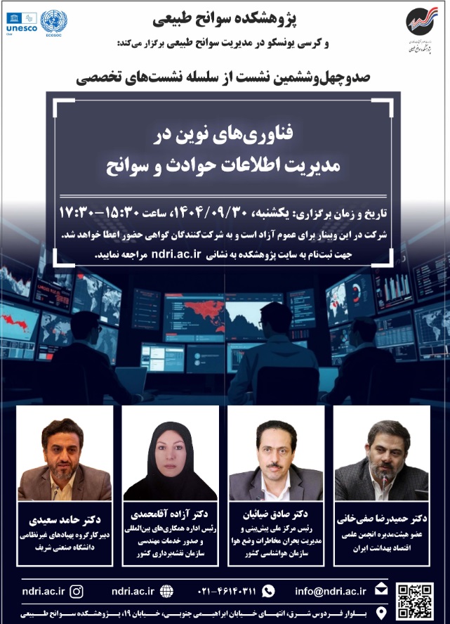 نشست فن آوری نوین در مدیریت اطلاعات حوادث وسوانح ۳۰ آذر ۱۴۰۴ | ۱۲:۰۴ کد : ۵۷۱۴۹ اطلاعیه ارسال به دیگران نام شما ایمیل شما ایمیل دریافتکننده ارسال انصراف تعداد بازدید:۳۱۰ دعوتنامه نشست فن آوری نوین در مدیریت اطلاعات حوادث وسوانح